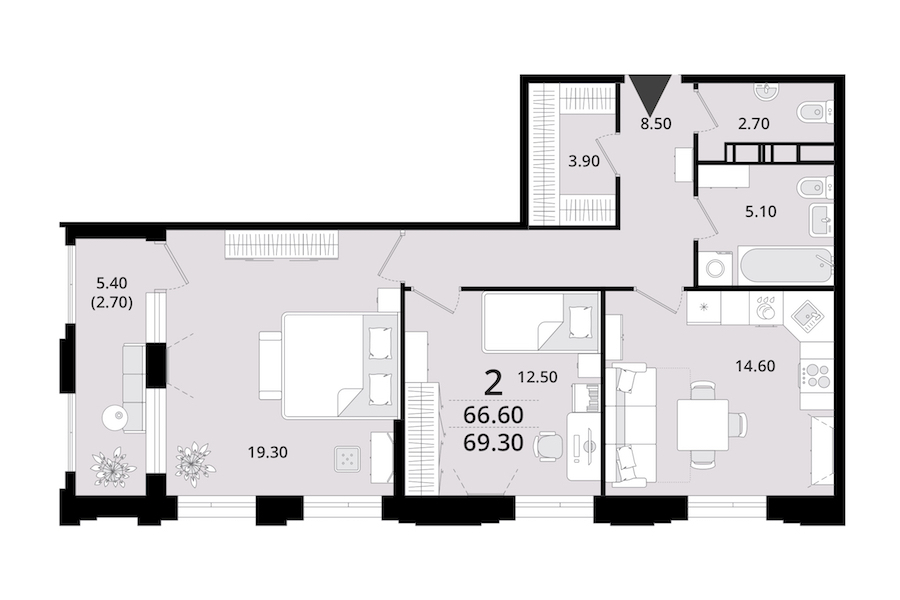 Двухкомнатная квартира на 11-ом этаже 67,2 кв.м
