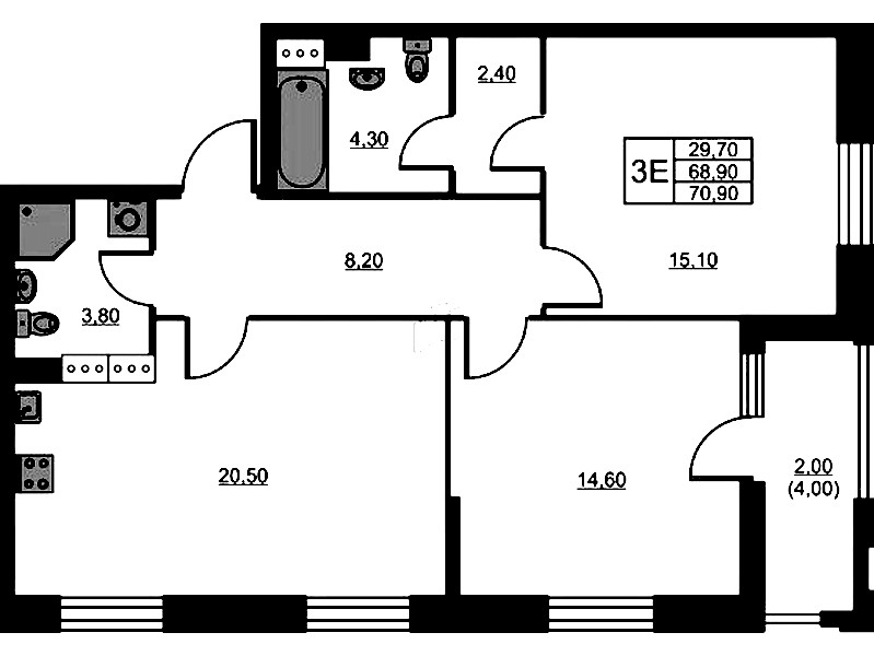 Двухкомнатная квартира на 4-ом этаже 70,9 кв.м