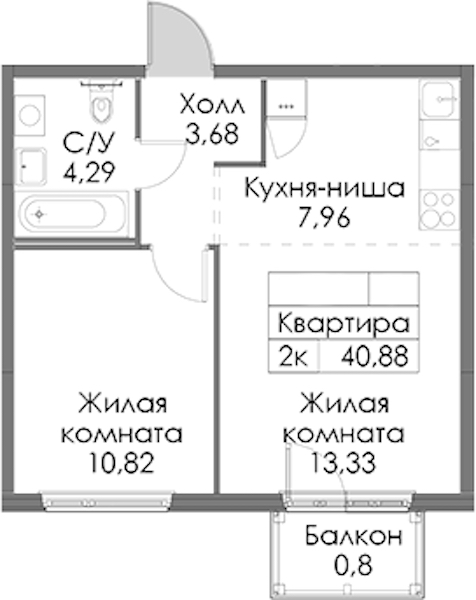 Однокомнатная квартира на 4-ом этаже 40,88 кв.м