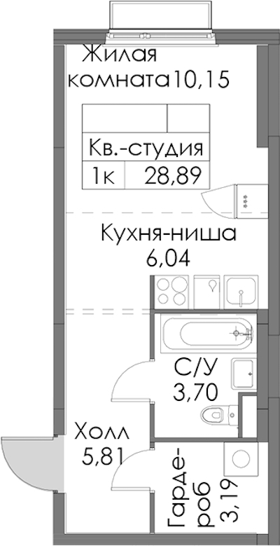 Квартира-студия на 6-ом этаже 28,89 кв.м