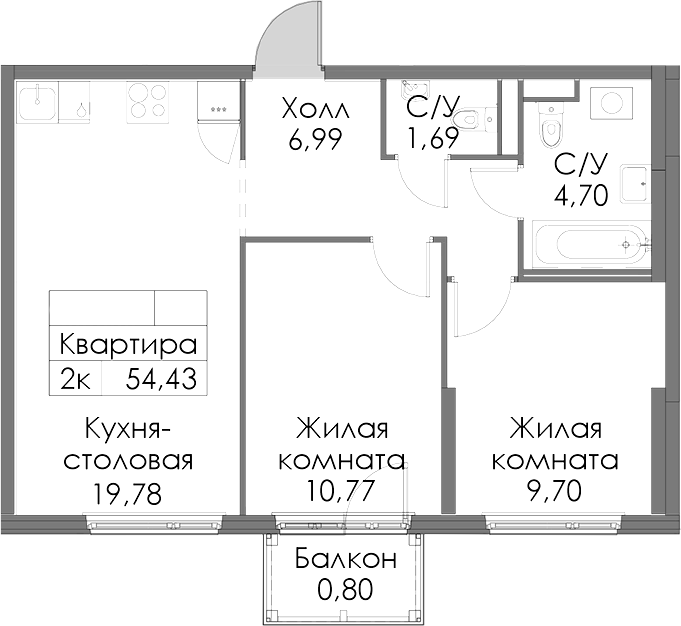 - Площадь54,43 м2