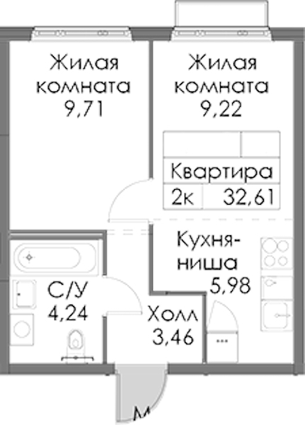 Однокомнатная квартира на 11-ом этаже 32,61 кв.м