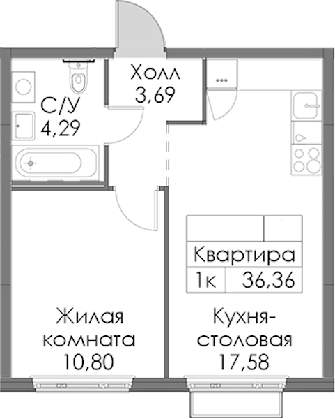 Однокомнатная квартира на 5-ом этаже 36,36 кв.м