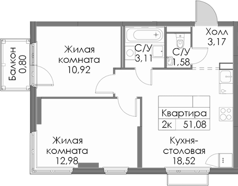 Двухкомнатная квартира на 3-ем этаже 51,08 кв.м