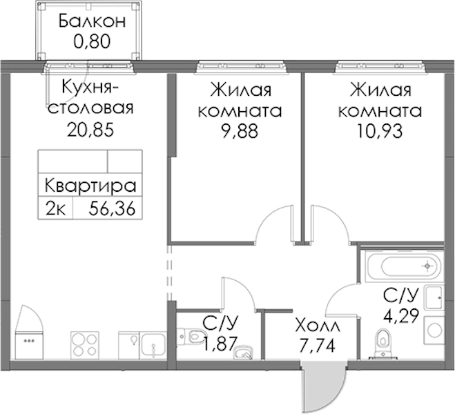 Двухкомнатная квартира на 4-ом этаже 56,36 кв.м