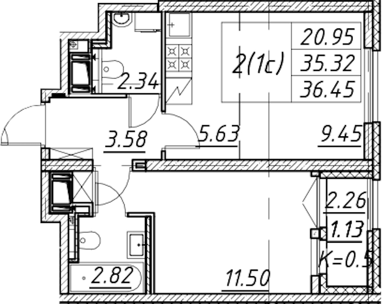 - Площадь36,45 м2
