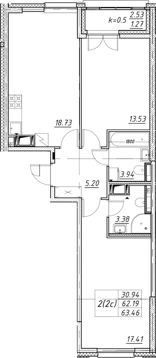 Двухкомнатная квартира на 8-ом этаже 63,46 кв.м