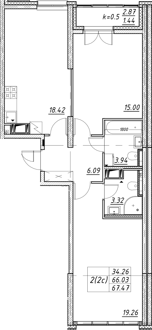 Двухкомнатная квартира на 15-ом этаже 67,47 кв.м