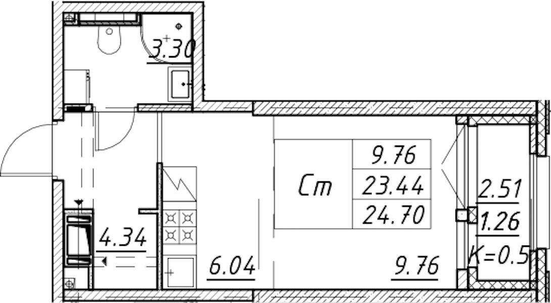 Квартира-студия на 12-ом этаже 24,7 кв.м