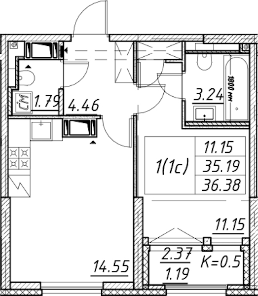 Однокомнатная квартира на 15-ом этаже 36,38 кв.м