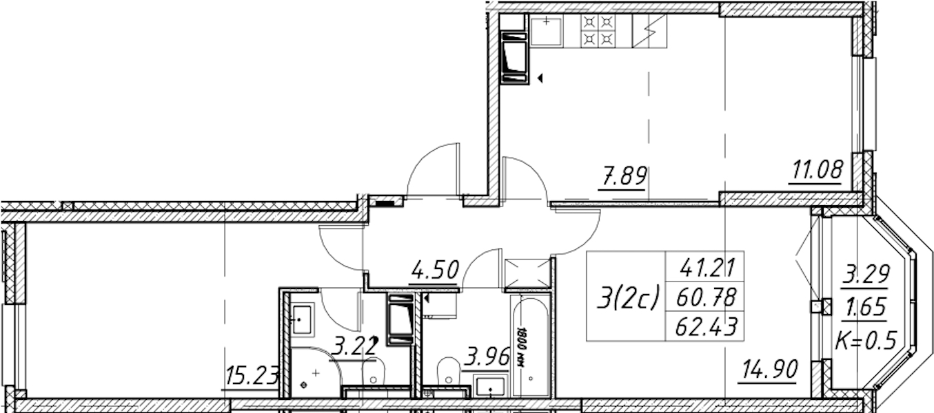 Двухкомнатная квартира на 12-ом этаже 62,43 кв.м