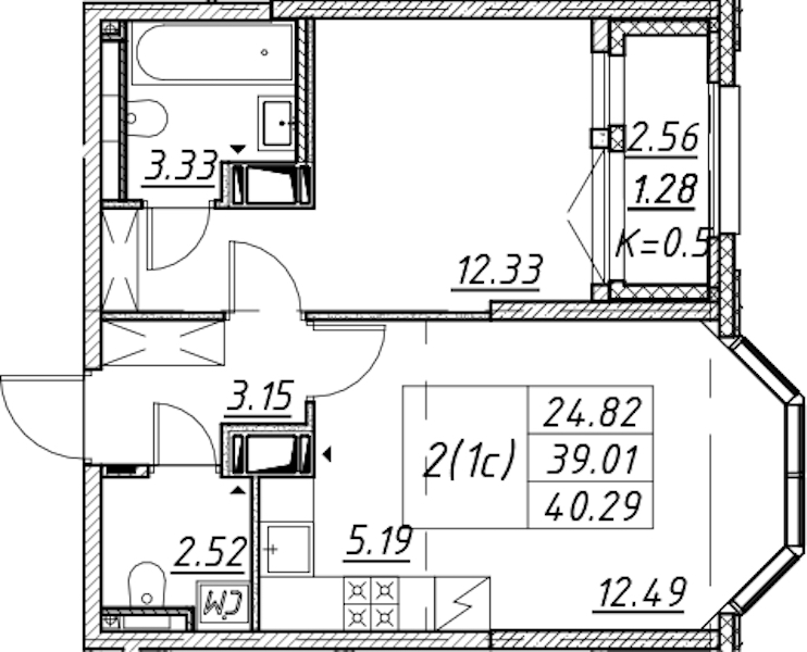 Однокомнатная квартира на 12-ом этаже 40,29 кв.м