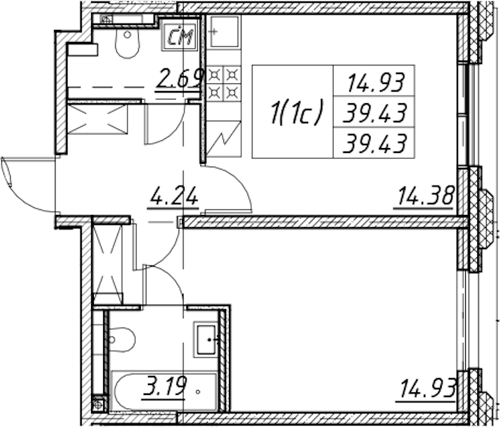 - Площадь39,43 м2