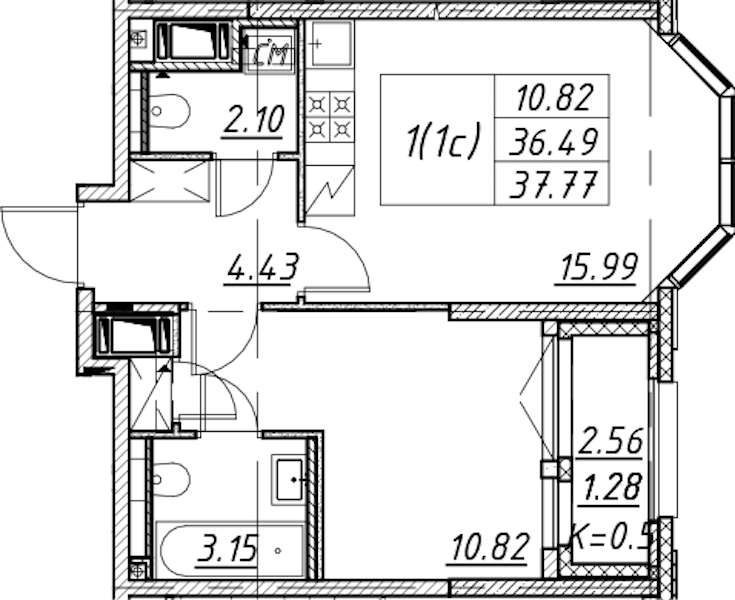 Однокомнатная квартира на 7-ом этаже 37,77 кв.м