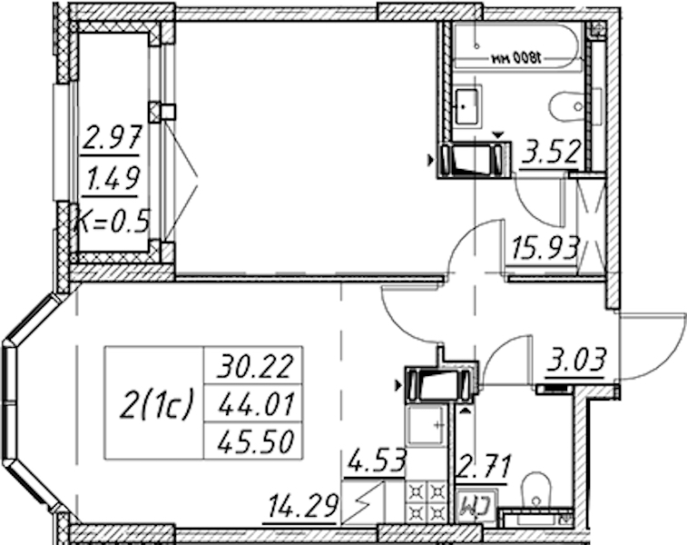 • Площадь45,5 м2