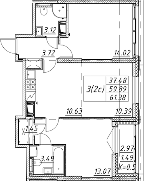 Двухкомнатная квартира на 12-ом этаже 61,38 кв.м