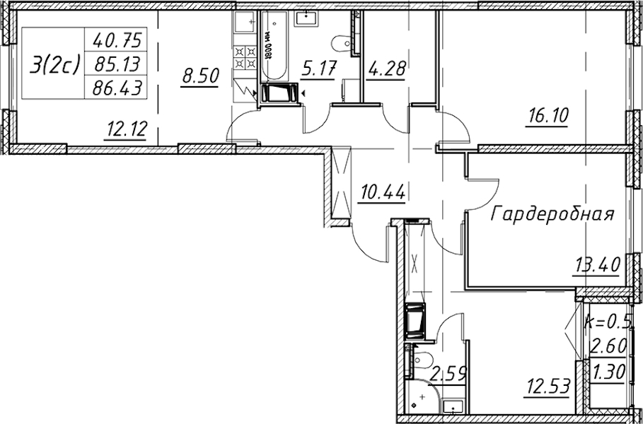 Двухкомнатная квартира на 7-ом этаже 86,43 кв.м