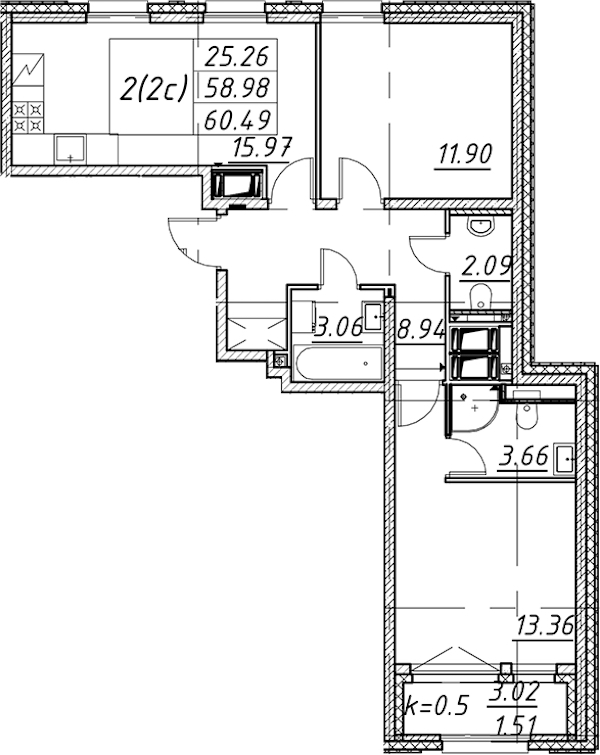 Двухкомнатная квартира на 10-ом этаже 60,49 кв.м