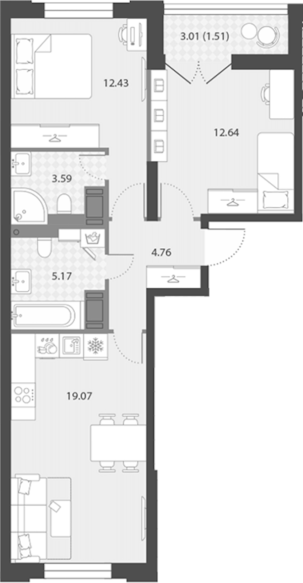 Двухкомнатная квартира на 12-ом этаже 59,17 кв.м