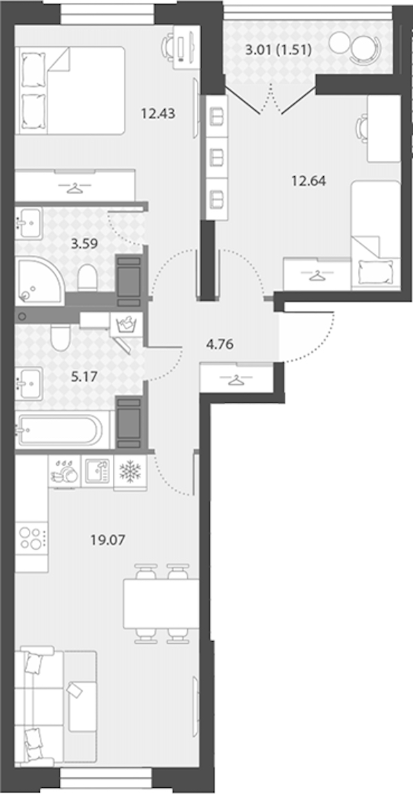 Двухкомнатная квартира на 15-ом этаже 59,17 кв.м