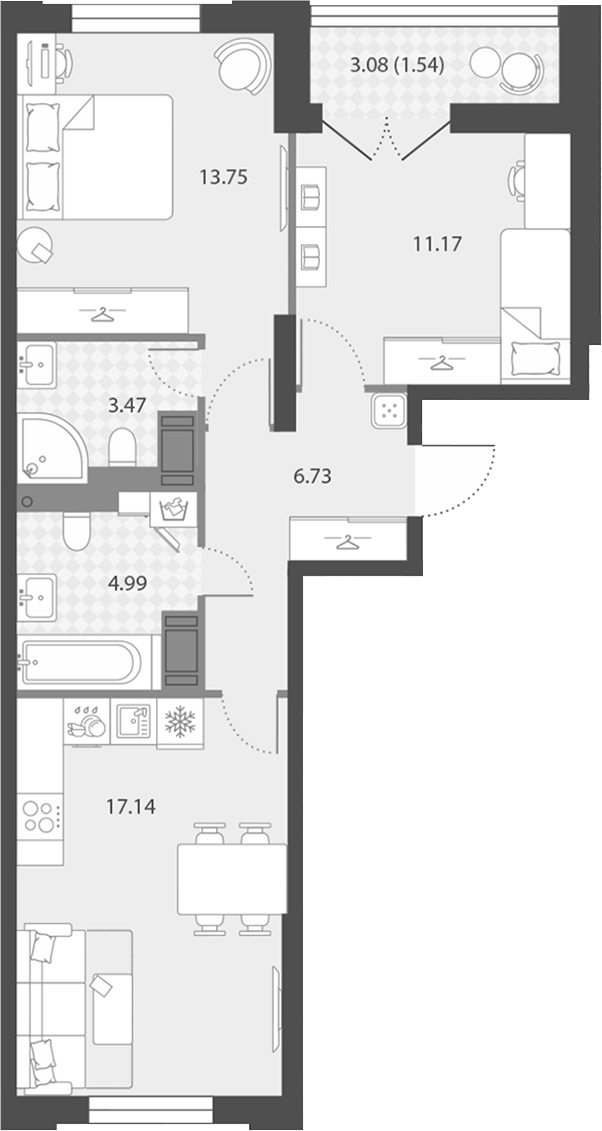 Двухкомнатная квартира на 6-ом этаже 58,79 кв.м