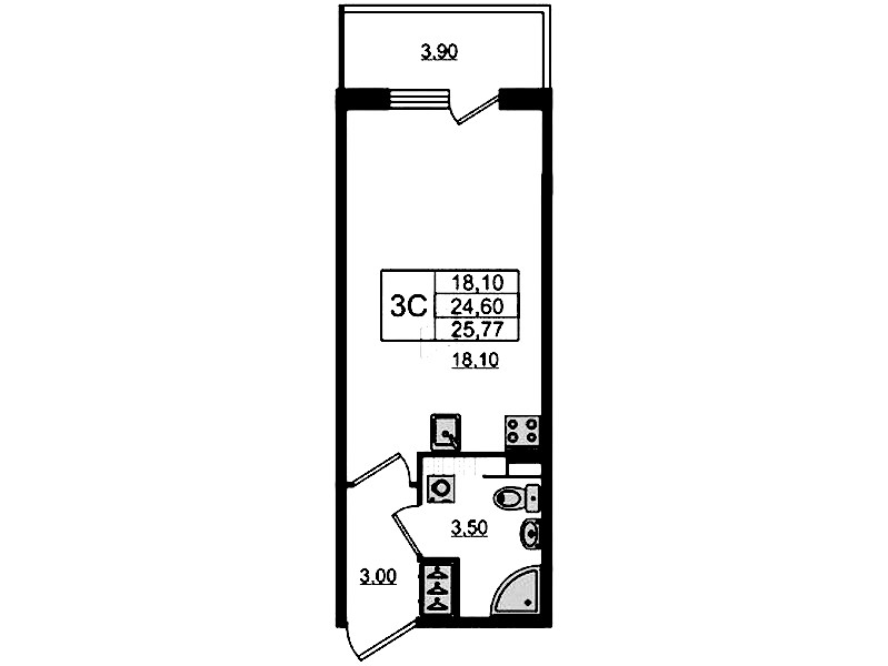 Квартира-студия на 4-ом этаже 24,6 кв.м