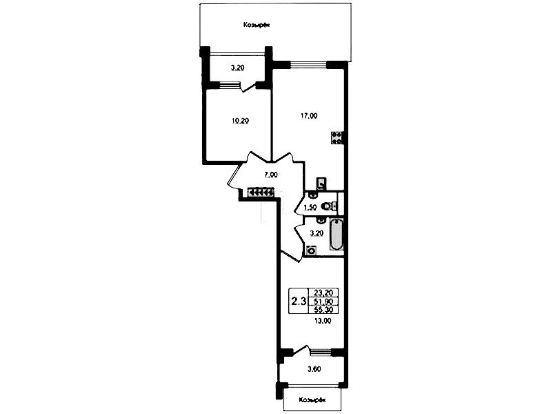Двухкомнатная квартира на 2-ом этаже 51,9 кв.м
