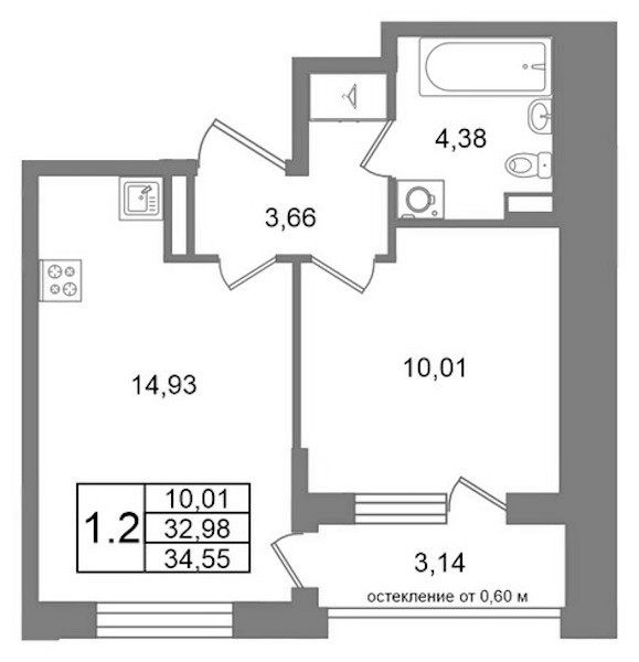 Однокомнатная квартира на 1-ом этаже 32,98 кв.м