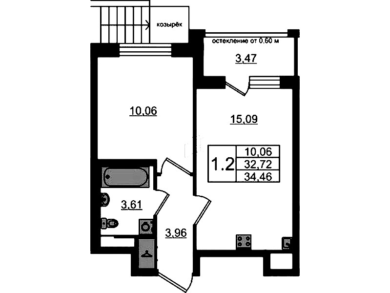 Однокомнатная квартира на 1-ом этаже 32,72 кв.м