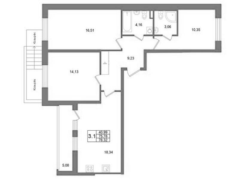Трёхкомнатная квартира на 1-ом этаже 75,78 кв.м