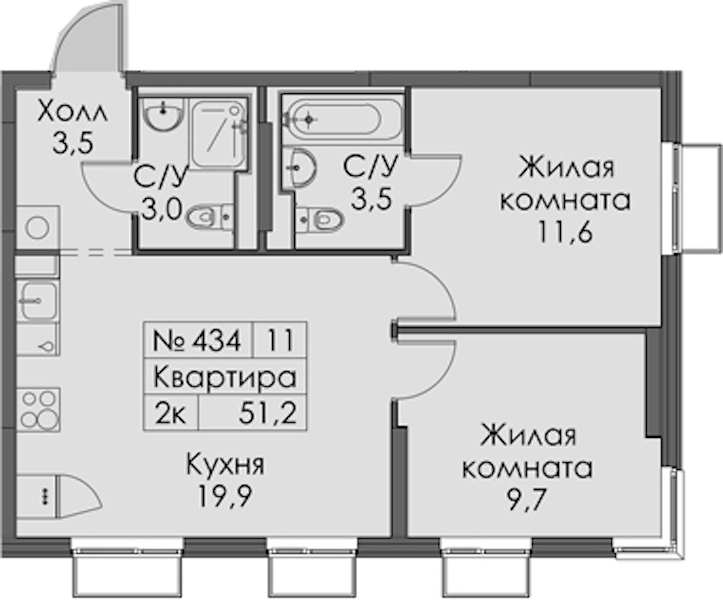 Двухкомнатная квартира на 3-ем этаже 51,2 кв.м