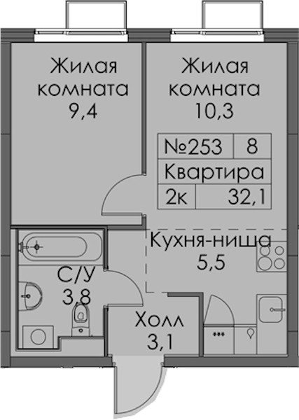Однокомнатная квартира на 11-ом этаже 32,1 кв.м