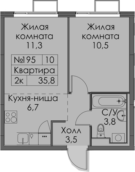 Однокомнатная квартира на 5-ом этаже 35,8 кв.м
