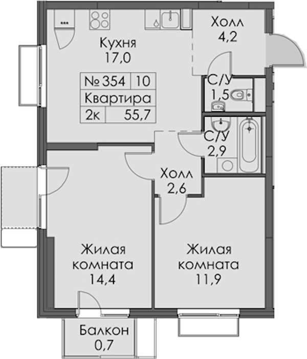 Двухкомнатная квартира на 8-ом этаже 55,7 кв.м
