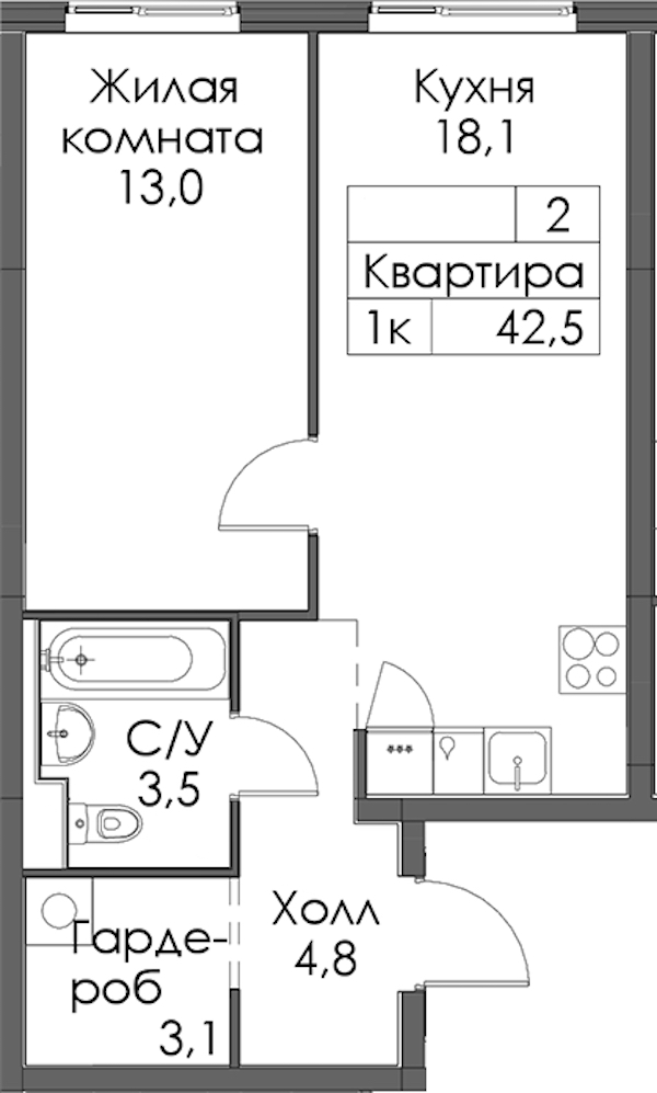 - Площадь42,5 м2