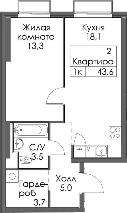 Однокомнатная квартира на 11-ом этаже 43,6 кв.м
