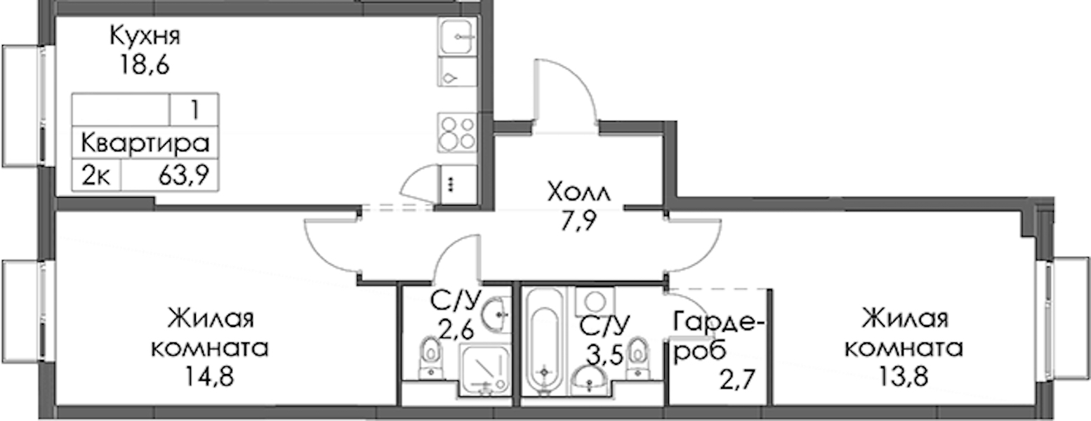 Двухкомнатная квартира на 7-ом этаже 63,9 кв.м