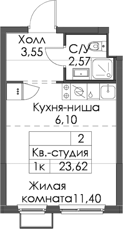 Квартира-студия на 12-ом этаже 23,62 кв.м