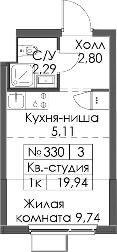 Квартира-студия на 11-ом этаже 19,94 кв.м