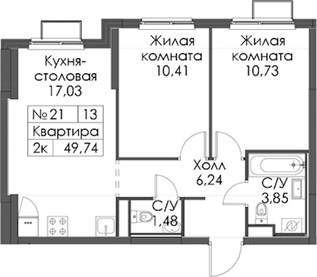 Двухкомнатная квартира на 14-ом этаже 49,74 кв.м