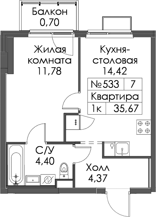 Однокомнатная квартира на 5-ом этаже 35,67 кв.м