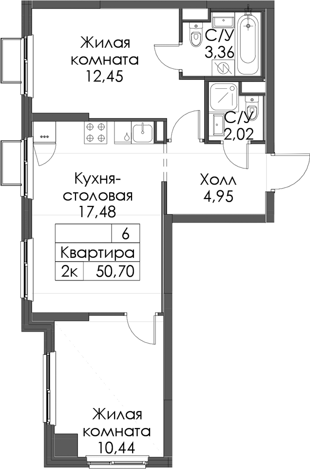 Двухкомнатная квартира на 13-ом этаже 50,7 кв.м