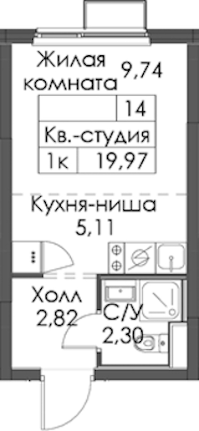 Квартира-студия на 14-ом этаже 19,97 кв.м