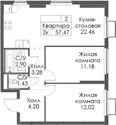 • Площадь57,47 м2