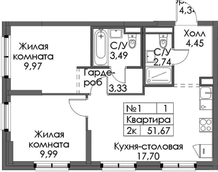 Двухкомнатная квартира на 1-ом этаже 51,67 кв.м
