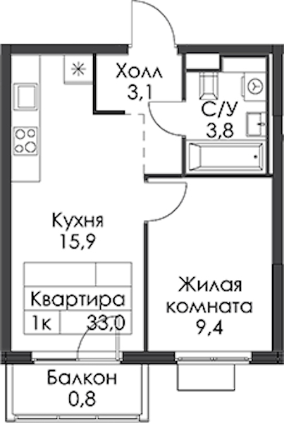 Однокомнатная квартира на 13-ом этаже 33 кв.м