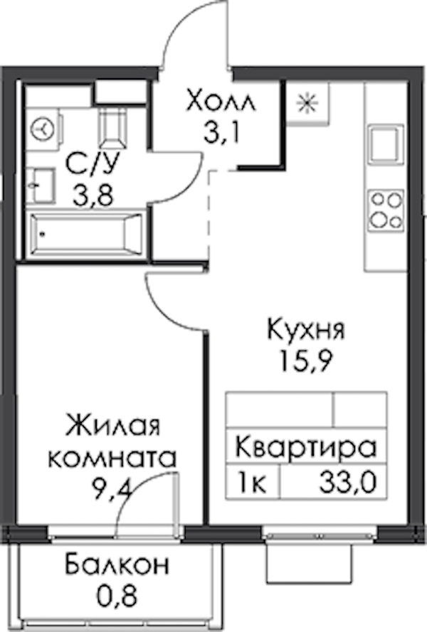 Однокомнатная квартира на 23-ем этаже 33 кв.м