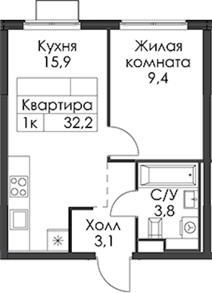 Однокомнатная квартира на 20-ом этаже 32,2 кв.м